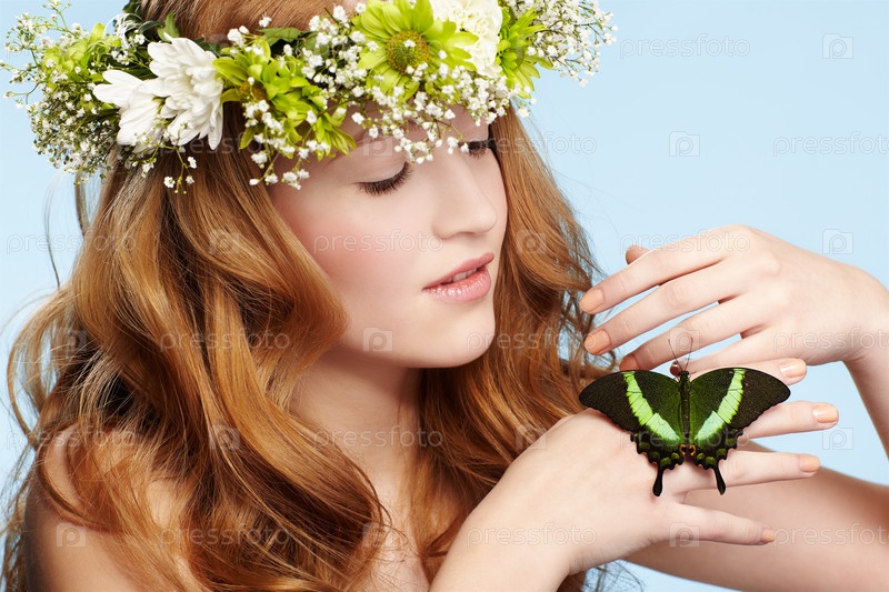 Рыжеволосая девушка с венком на голове и с бабочкой на руке