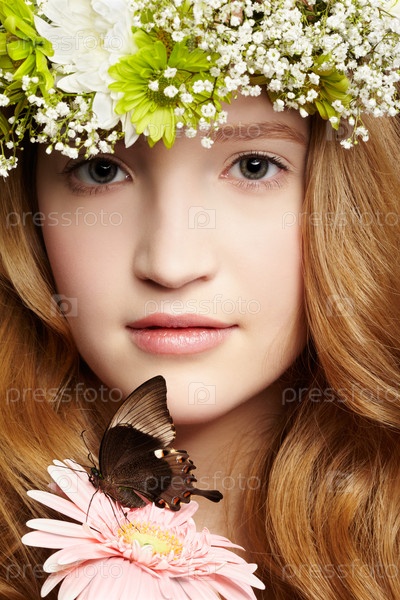 Рыжеволосая девушка с венком на голове держит бабочку на цветке