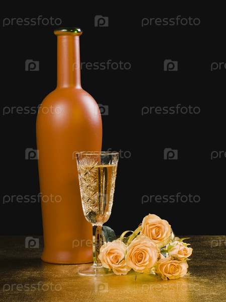 Бутылка, бокал с вином и розы, на черном фоне