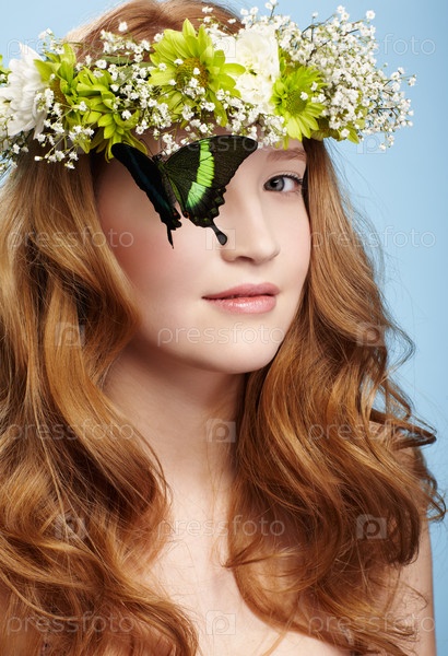 Бабочка закрыла глаз рыжеволосой девушки с венком