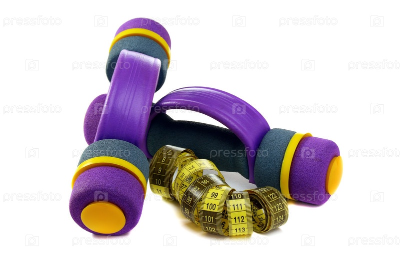 Цветные гантели и сантиметр, изолированы на белом фоне
