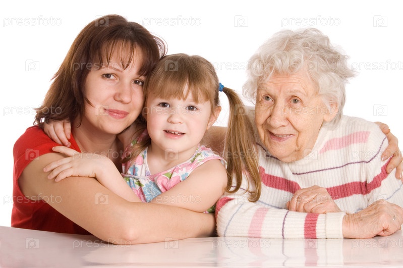 Пожилая женщина с внучкой и дочкой на белом фоне