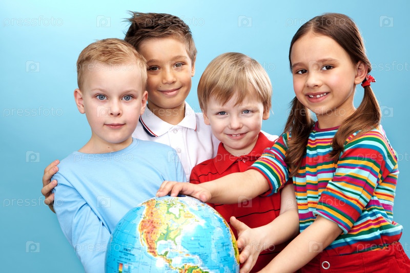 Счастливые дети с глобусом на синем фоне