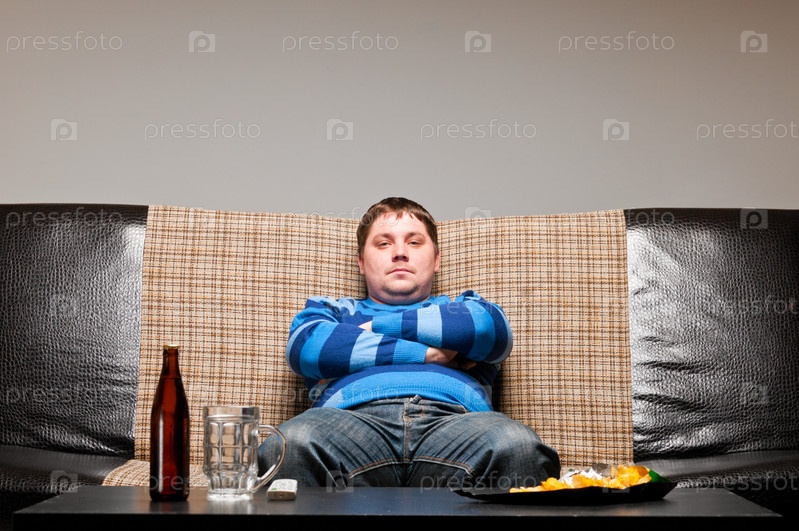 Футбольный фанат сидит на диване с бутылкой пива и закусками на столе