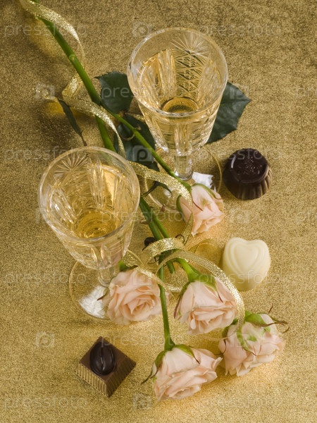 Шампанское, букет роз и шоколадные конфеты на золотом фоне