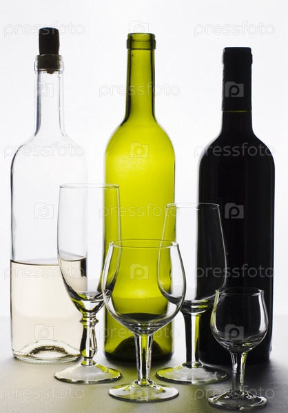 Три бутылки вина и набор бокалов на светлом фоне