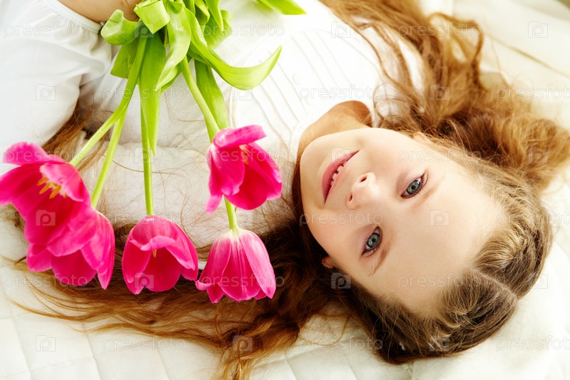 Счастливая девочка с тюльпанами