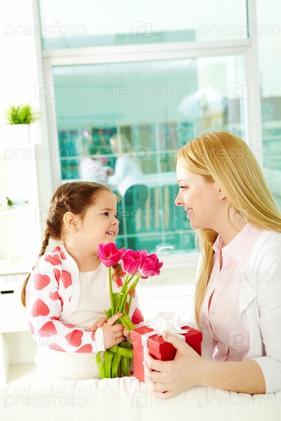 Девочка дарит букет маме