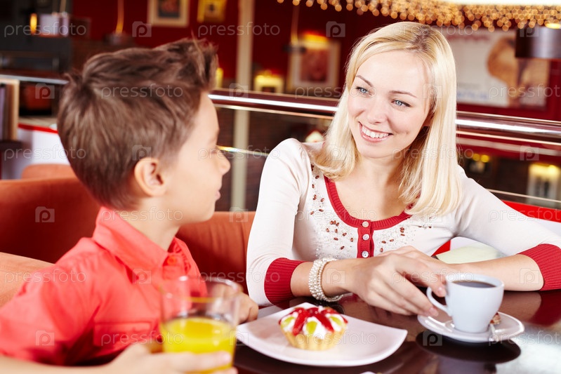 Мама с сыном сидят в кафе