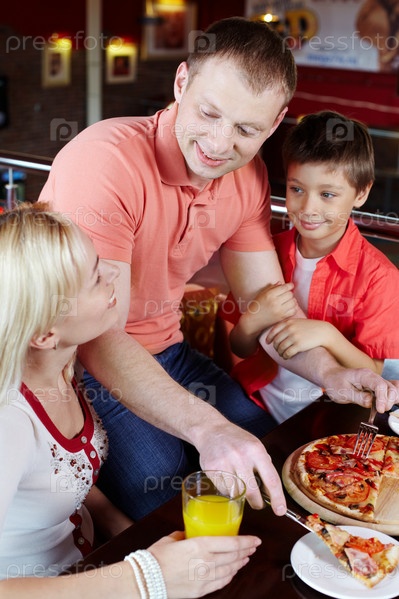 Семья из трех человек обедает в пиццерии