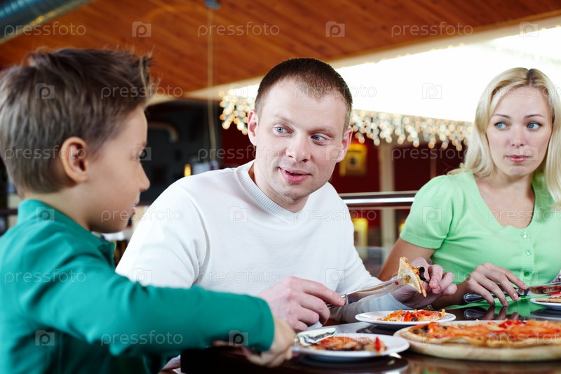 Семья обедает в пиццерии