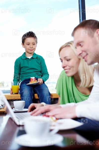 Семья из трех человек отдыхает в кафе