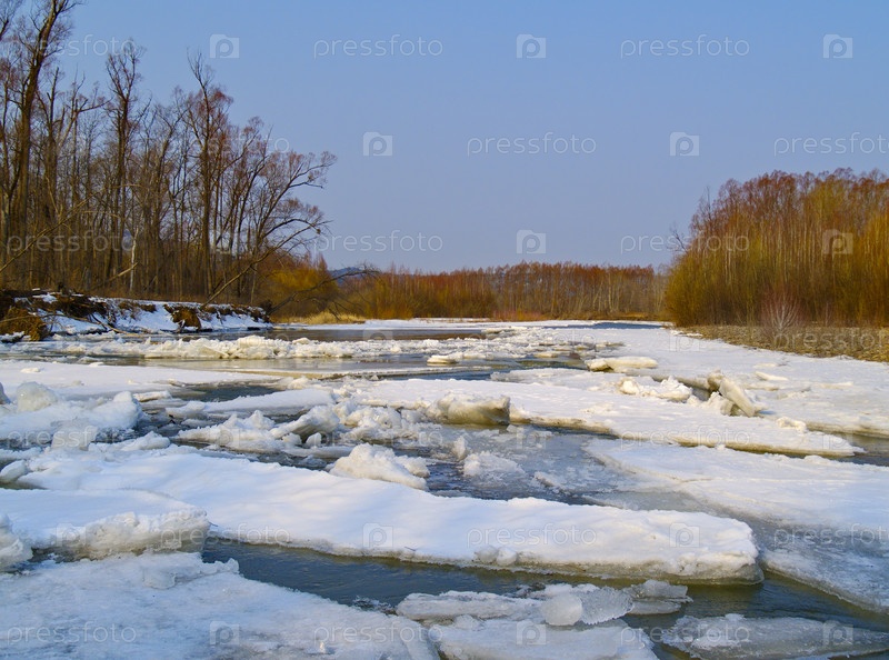 Начинающий таять лед на реке весной