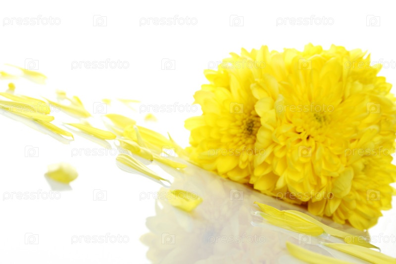 Цветы и лепестки желтых хризантем на белом фоне