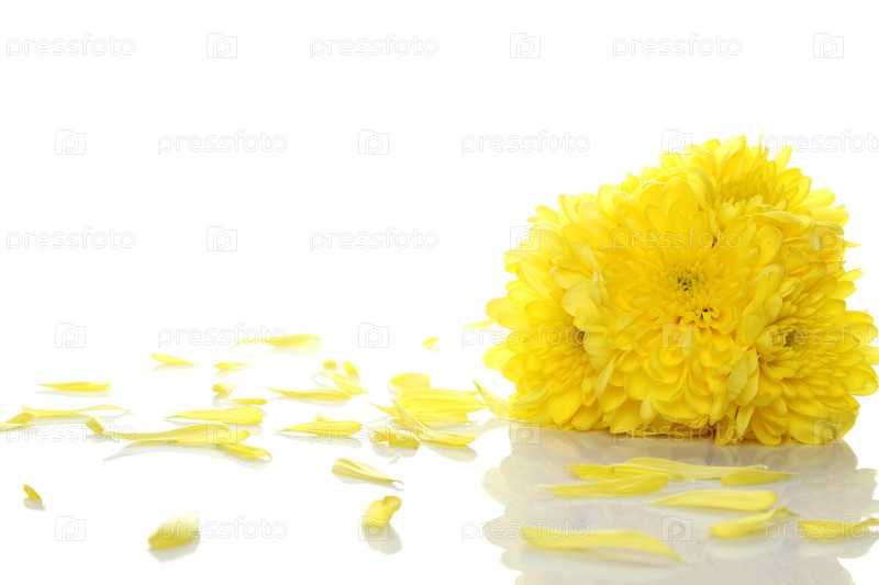 Цветы и лепестки желтых хризантем на белом фоне
