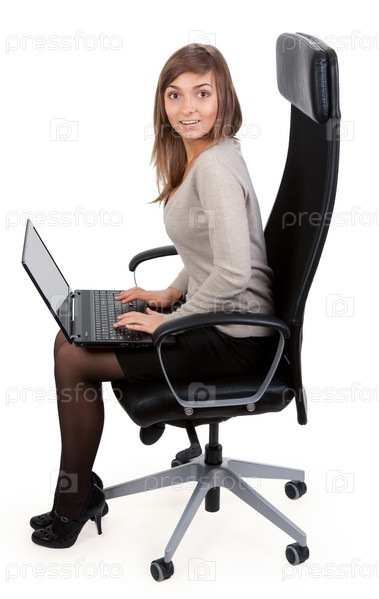 Девушка сидит в кресле с ноутбуком