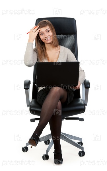 Молодая женщина сидит в кресле с ноутбуком
