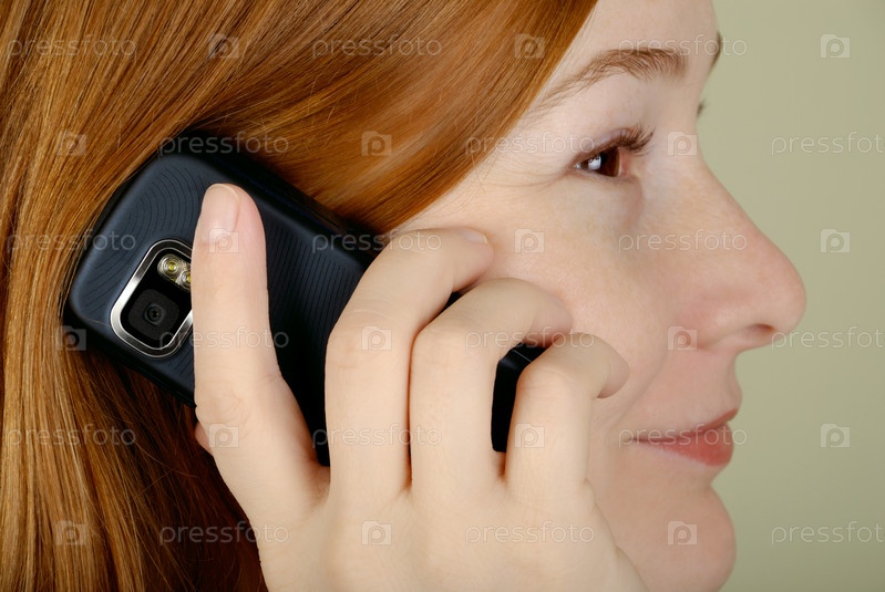 Рыжеволосая молодая женщина разговаривает по мобильному телефону
