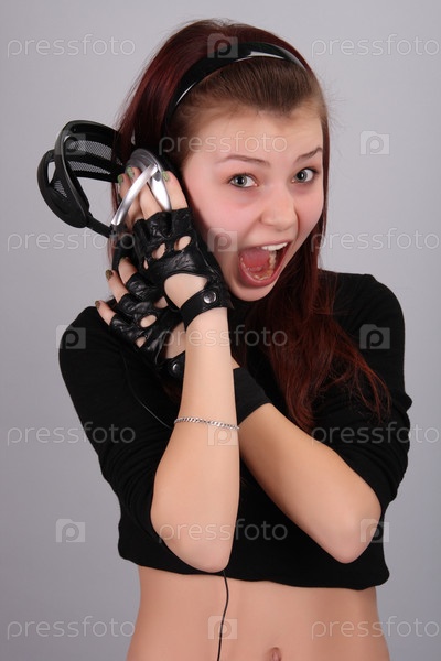 Молодая эмоциональная девушка слушает музыку в наушниках на сером фоне