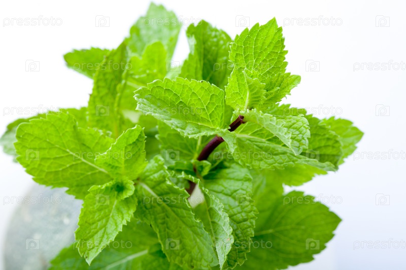 Ярко-зеленые свежие листья мяты на светлом фоне