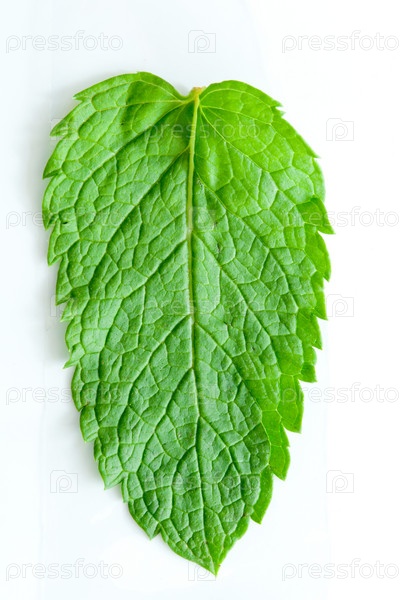 Ярко-зеленый свежий лист мяты на светлом фоне