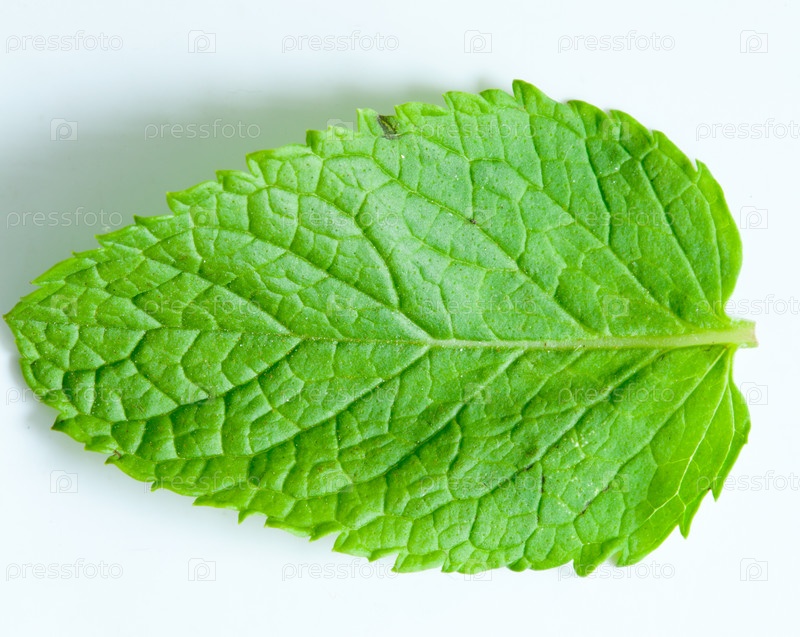 Ярко-зеленый свежий лист мяты на светлом фоне