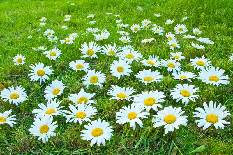 Большие белые ромашки на фоне зеленой травы, крупный план