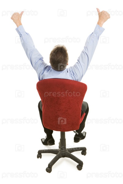 Задний вид босса, сидящего на кресле и показывающего знак - хорошо