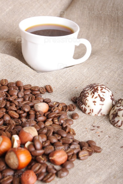 Чашка кофе, кофейные зерна, орехи и конфеты