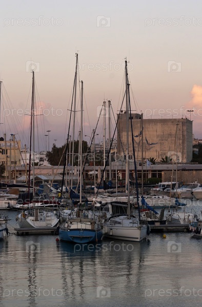 Пришвартованные яхты на фоне города (город Ираклео, осторов Крит,Греция)
