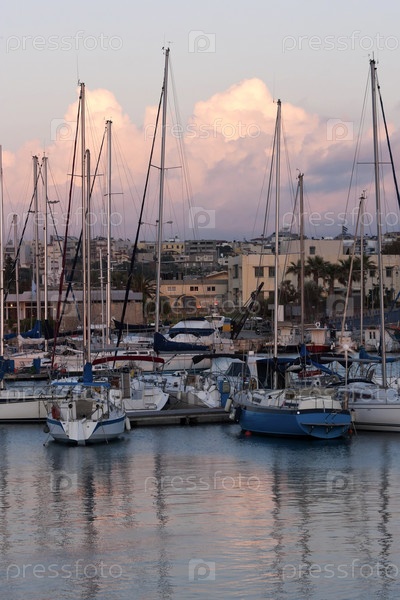 Пришвартованные яхты на фоне города (город Ираклео, осторов Крит,Греция)