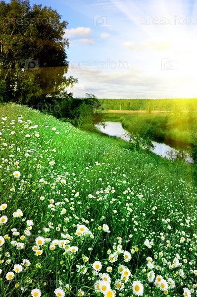 Прекрасный закат и красивые ромашки на летних холмах