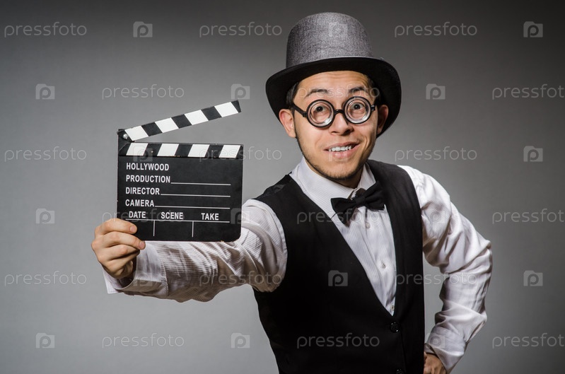 Забавный мужчина с кинохлопушкой