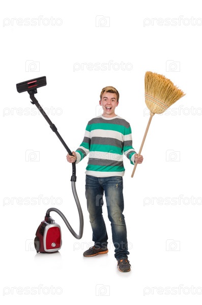 Человек с пылесосом и веником