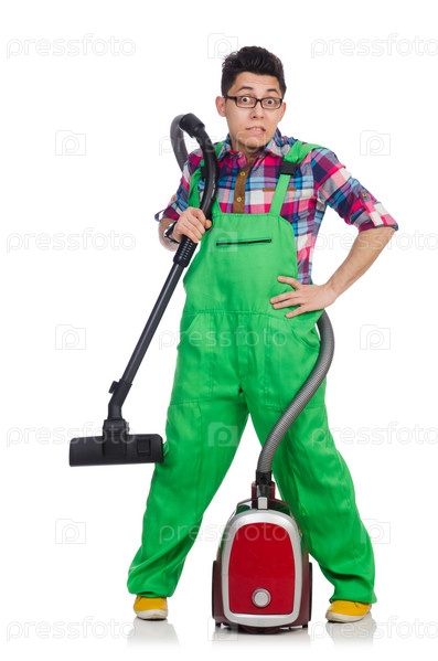 Смешной мужчина с пылесосом