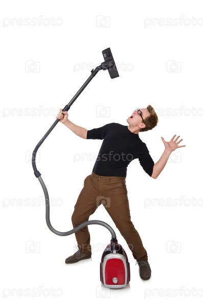 Забавный человек с пылесосом