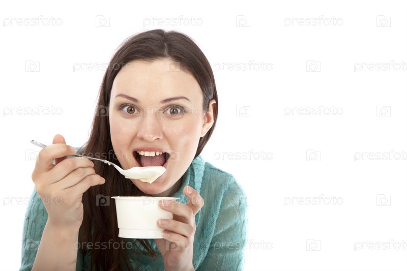 Девушка жадно кушает мороженое