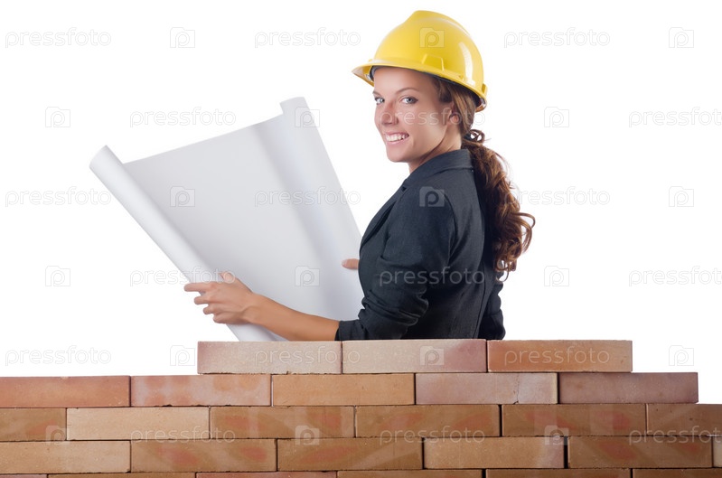 Строитель возле кирпичной стены