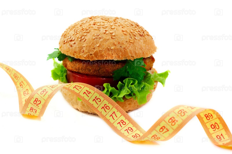 Гамбургер и сантиметровая лента на белом фоне