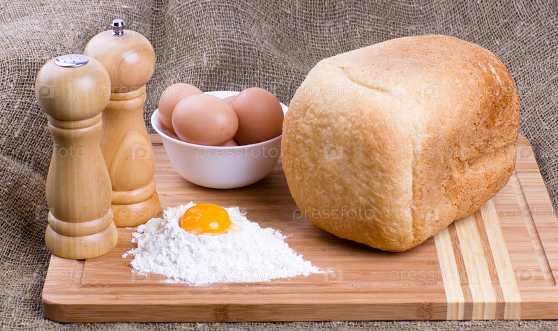Желток, яйца, соль, перец, пшеничная мука и хлеб на кухне
