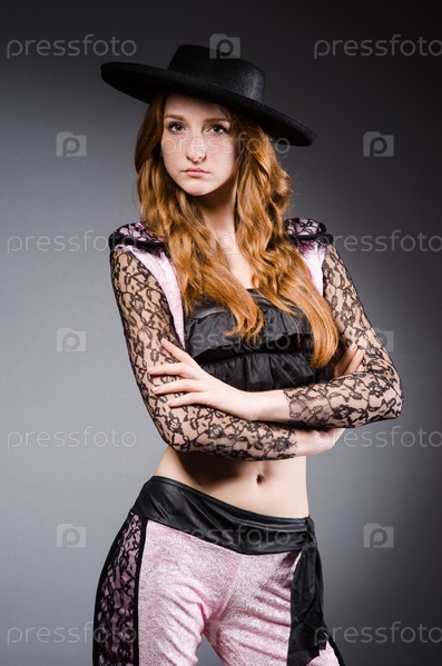 Женщина тореадор на сером фоне