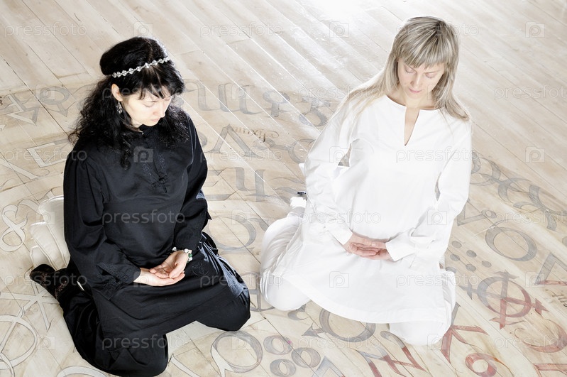 Две молодые женщины в белом и черном практикуют йогу