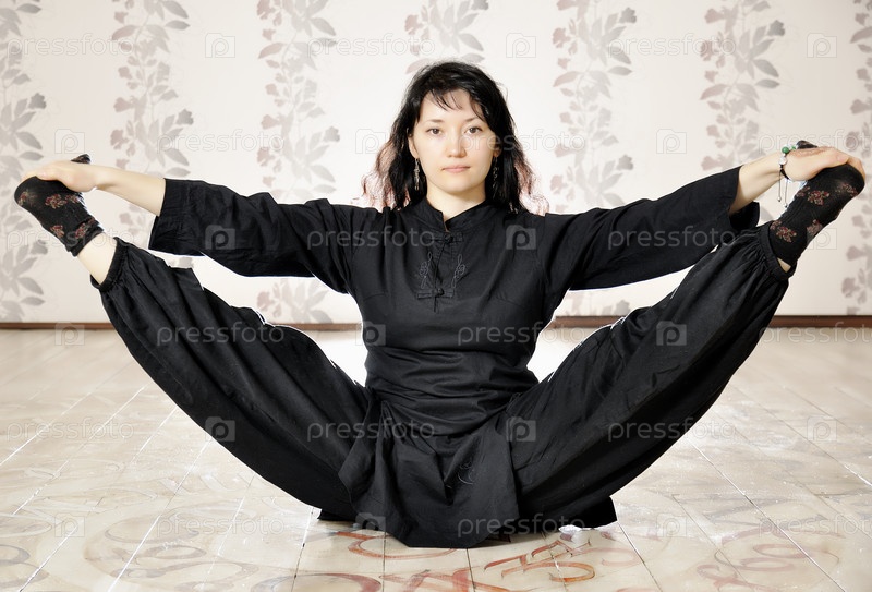 Молодая женщина в черном делает растяжку