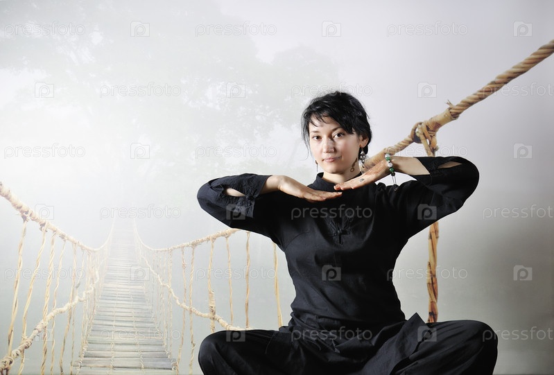 Молодая женщина в черном сидит в позе лотоса