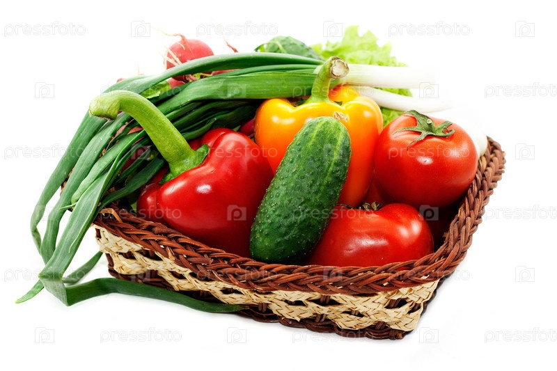 Помидоры, огурцы, зеленый лук и перец в плетеной корзине, изолированы на белом фоне
