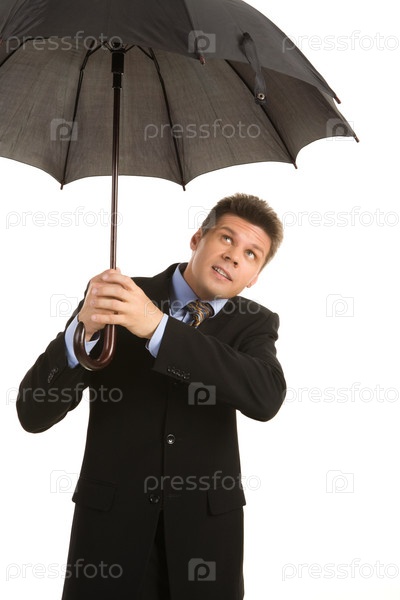 Вертикальное изображение бизнесмена, который смотрит на свой зонтик