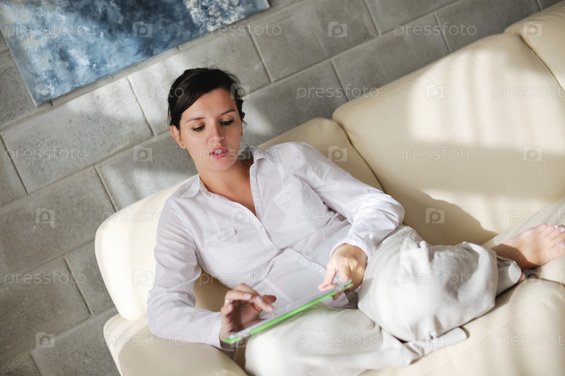 Женщина с планшетом сидит на диване