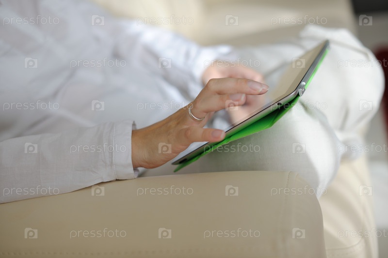 Женщина с планшетом сидит на диване