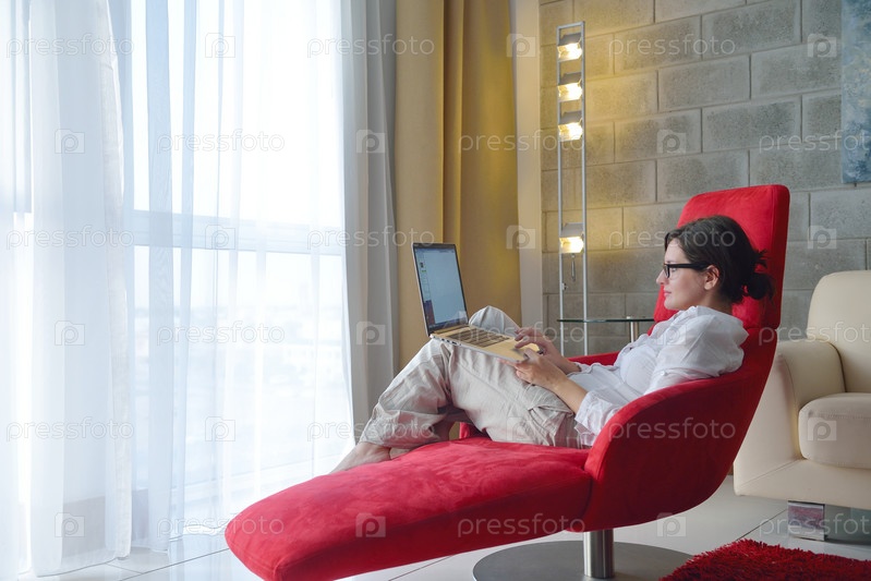 Женщина с ноутбуком сидит в кресле