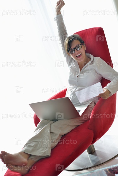 Женщина с ноутбуком сидит в кресле